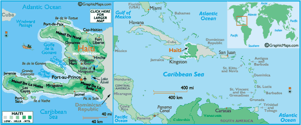 País das Caraíbas. O Haiti ocupa a parte ocidental da ilha de Hispaniola, uma das Grandes Antilhas do mar das Caraíbas,e abrange uma área de 27 750 km2.